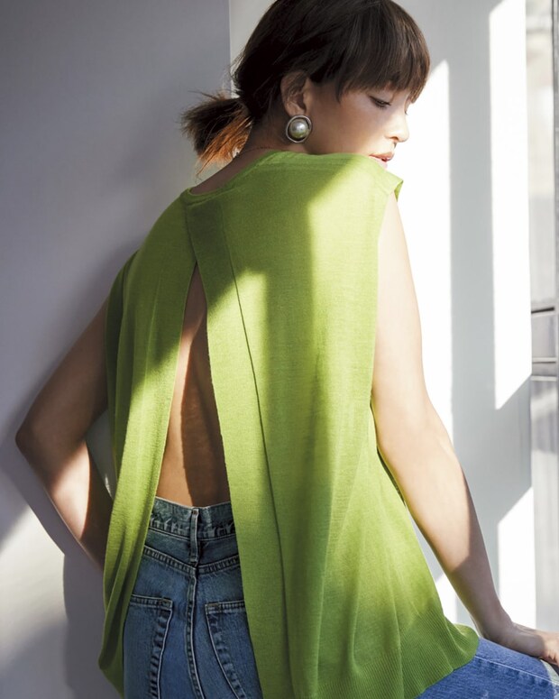 背中あきのニットも、目の詰まったハイゲージでコンサバ寄りの見た目ゆえ落ち着いた雰囲気。