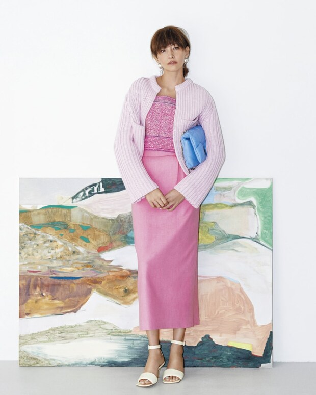 インナーのジャカード織で柄をMIXしてリズム感を演出。オール無地でまとめるよりもぐっとナチュラルな仕上がりに。カーディガン¥198,000(ブラミンク)、キャミソール¥42,900、スカート¥34,100(共にロンハーマン)、ピアス¥91,300(ソフィー ブハイ/エスケーパーズオンライン)、バッグ¥193,600(マルベリー/マルベリージャパン)、サンダル¥33,000(ピッピシック/エストネーション)