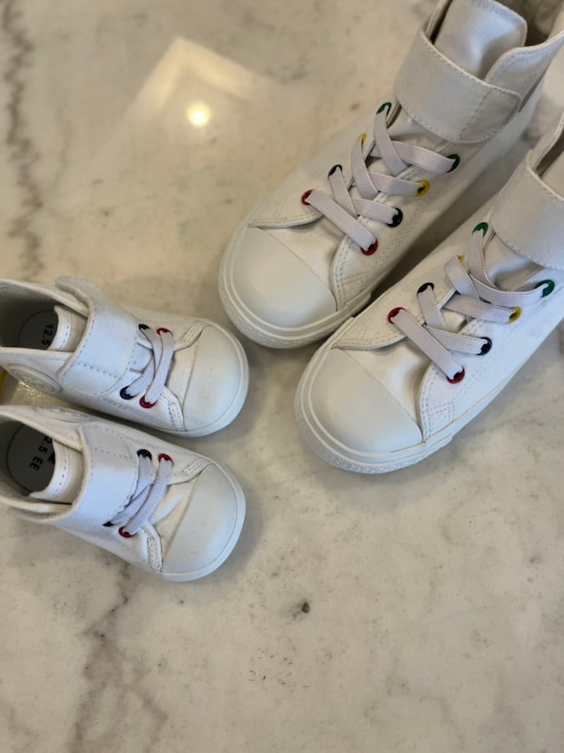 「またまたお揃いネタですが(笑)。元アシスタントからもらったこちらのギフト。コンバースの白いスニーカーなのですが、お姉ちゃんの分もお揃いでくれて嬉しかったな。一緒にはけるようになる日が来るのを、長女も心待ちにしています」