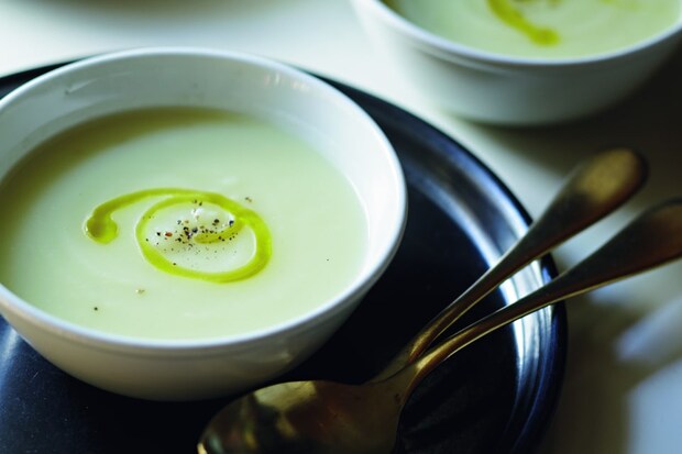 3_2をハンディブレンダーでなめらかになるまで撹拌し、塩を加えて味を調える。器に盛り、オリーブ油をかけて黒こしょうをふる。
