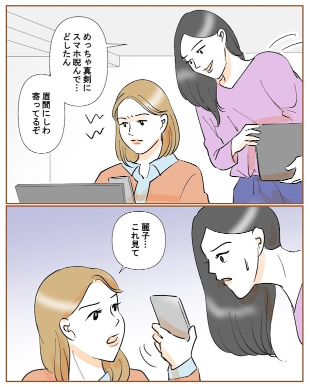 和也からのメッセージがあまりにも気持ち悪くて、軽蔑の眼差しでスマホを睨みつけていると、同期の麗子が「めっちゃ真剣にスマホ睨んで・・・眉間にしわ寄ってるぞ」と声をかけてきました。私はすぐさま麗子に「これ見て」と和也から送られてきたメッセージを見せました。