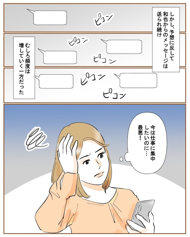 しかし私の予想に反して、和也からのメッセージは止まるどころか、むしろ日に日に増えていきました。溜まり続けるメッセージにノイローゼになりそう。「今は仕事に集中したいのに・・・最悪!」あまりのしつこさに、私は思わず頭を抱えたのでした。