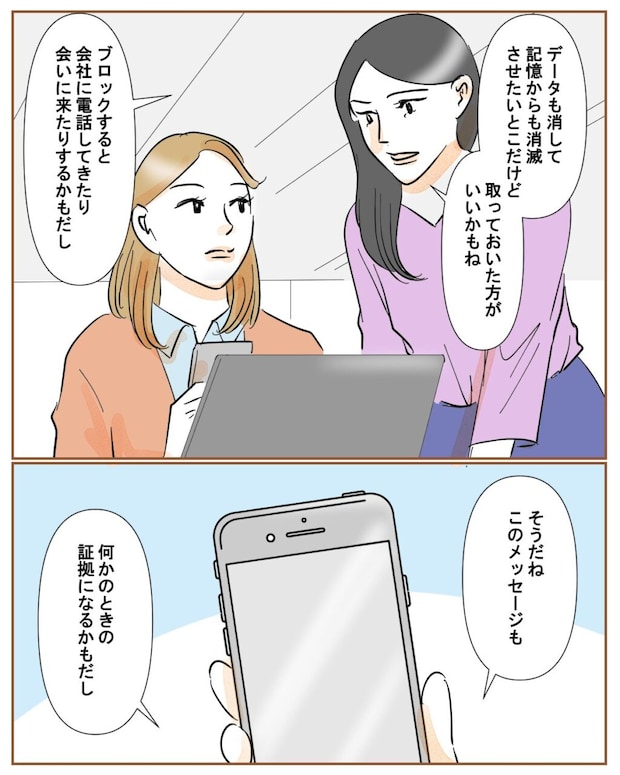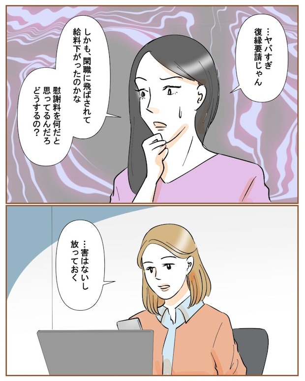 和也のメッセージを読んだ麗子は、引き気味に「ヤバすぎ、復縁要請じゃん」とつぶやきます。そして「しかも閑職に飛ばされて給料下がったのかな?慰謝料を何だと思ってるんだろ、どうするの?」と心配そうに聞いてきました。正直、もう和也とは関わりたくありません。触らぬ神に祟りなしということで、このまま放っておくことにしました。