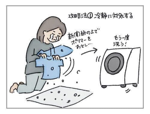 攻略法・・・というか対処法としては、もう、冷静に対処するしかありません。新聞紙を広げ、その上でひとつひとつ、洗濯物からポリマーを振り落とします。そして、もう一度洗濯機へ。やること自体はそこまで大変じゃないのですが、その惨状と、どうしてこうなってしまったのかというショックとで、泣きながら振り落としましたよね・・・。