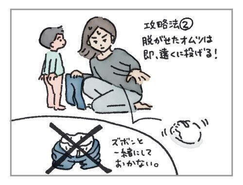 この惨状を防ぐ攻略法として実施しているのは、脱がせたオムツを即、遠くに投げること!あまりお行儀よくはないですが・・・。脱がせたオムツは本来すぐにゴミ箱に入れたいものですが、忙しい育児の日々、そうはいかないのが現実じゃないですか?例えば自分がお風呂に入っていたりして、ビショビショのまま脱衣所で子どもを脱がせる、とか。その時に、ズボンなどとオムツを一緒にしておくと、そのまま気づかずに洗濯してしまうリスクが増大。とりあえず洗濯物とオムツは物理的に離しておくことが効果的、と信じて、いつもオムツを投げています。