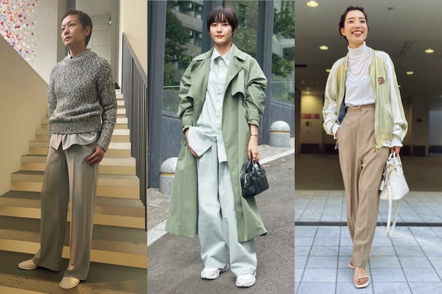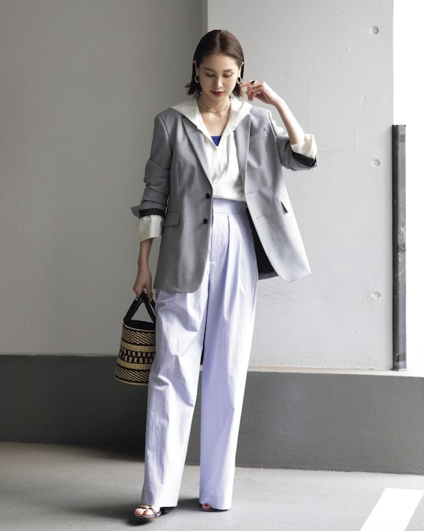 ライトグレーのジャケットにラベンダーのパンツを合わせ、淡いトーンでまとめた二ノ宮さん。マニッシュなアイテムをコーデしながらも優しい雰囲気に。インナーに差したブルーもポイント。