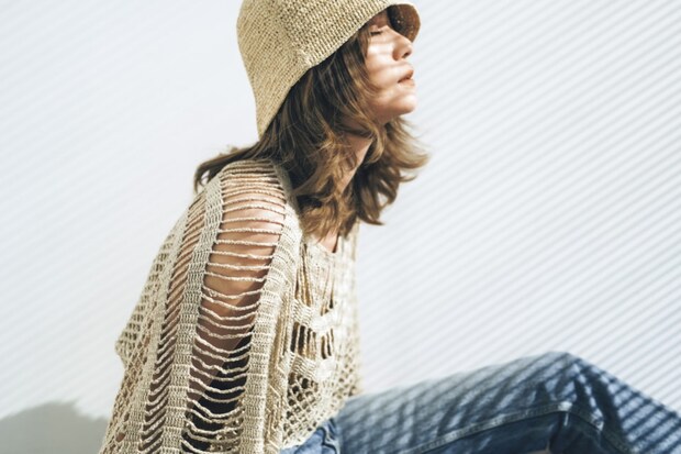 「クロシェニットも目につきます。もともとかぎ針編みが好きだから、嬉しいですね。といっても派手な色や柄のパッチワークのものではなく、落ち着いたワントーンのもの。帽子でダサ可愛くしてもいいし、ドレスもいい。程よく肌が透けるから大人でも素敵に着られそうですね」