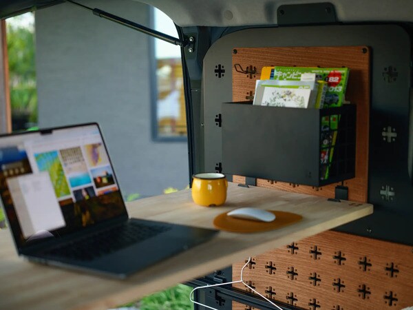 他にも、25mmピッチを活かした「動くPCデスク&周辺機器収納」でガジェットをミリ単位で配置し、車内を即席オフィスとして活用することもできる。