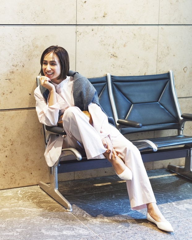 ピンクバンドカラーシャツ¥30,800、ピンクパンツ¥35,200(共にオーラリー)、肩に掛けたニット¥5,990(ザラ/ザラ カスタマーサービス)、パンプス¥33,000(PIPPICHIC/ベイジュ)、右手薬指につけたリング¥28,600、右手小指につけたリング¥22,000、左手のリング¥19,800(3点エナソルーナ)、抱えたバッグ¥49,500(デメリエー ロンドン/アパルトモン 青山店)