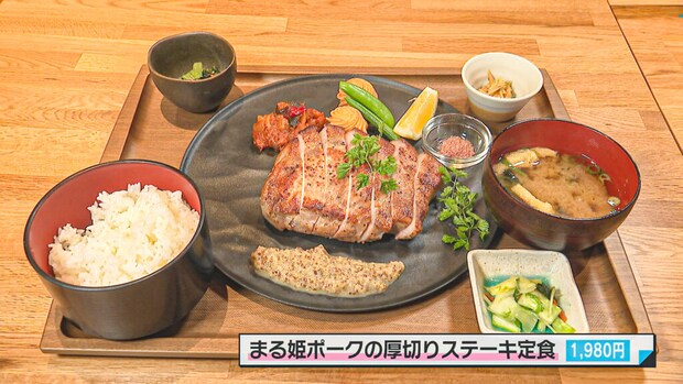 施設内のレストランで食べられる江津のブランド豚「まる姫ポーク」のステーキ。