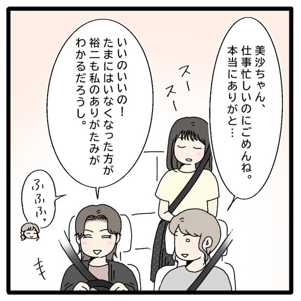 私を心配した美沙ちゃんが「そう・・。正志君ちにはとても置いておけないから、ひとまず2人を家まで送るよ」と言ってくれ、申し訳ないと思いつつも義実家へ戻る気にはなれず、自宅まで送ってもらうことにしました。
