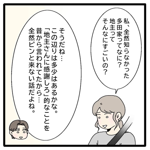「私、全然知らなかった。多田家ってなに?地主ってそんなにすごいの?」私は正志や義母には聞けなかったことを聞いてみました。「そうだね・・。この辺りは多少はあるかな。『地主さんに感謝しろ』的なことを昔から言われてたから・・。全然ピンとこない話だよね」美沙ちゃんは私の気持ちに寄り添いつつも、地元で多田家がいかに特別な存在なのかを話してくれました。