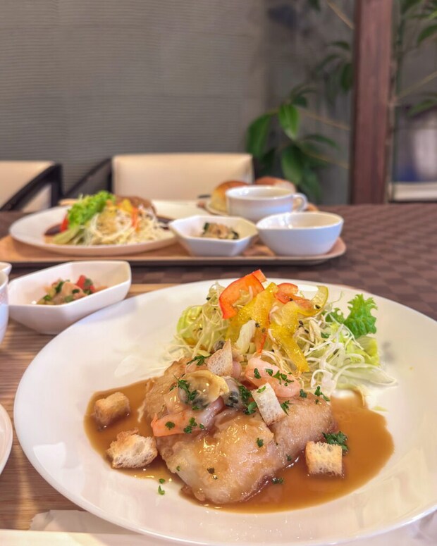 ふっくらとした白身魚に、アサリやエビ、クルトンを添えて贅沢に仕上げた白身魚のムニエル。