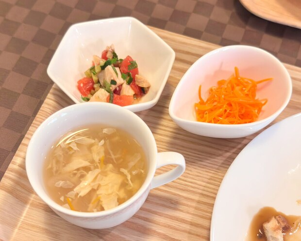 小鉢は人参のラペと、鶏ハムサラダです。スープは鶏ガラをベースに、