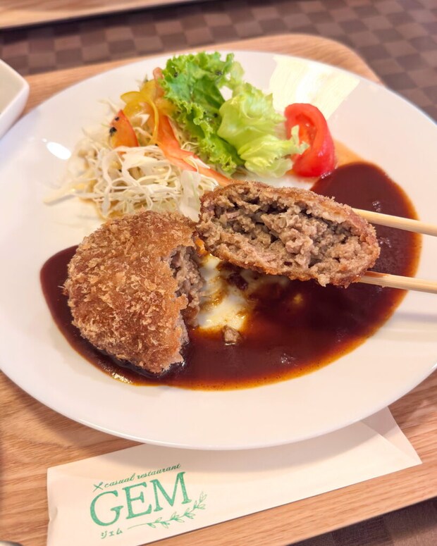 食べ応えのある大きなメンチカツの具材に使われているのは、なんとGEMさんの看板料理の一つである「へんみさん家のハンバーグ」のタネなんです。