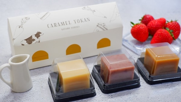 「キャラメル羊羹アソート」は、3種類のキャラメル羊羹がセットになった商品。味わいも見た目もミルキーな「ミルクキャラメル羊羹」、いちご果肉をたっぷり使った「いちごキャラメル羊羹」、香ばしい「焦がしキャラメル羊羹」がオリジナルボックスに入っている。
