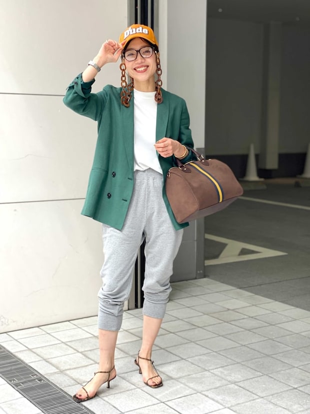 ジャケット¥64,900(リジエール)、中に着たタンクトップ¥13,200(ユニオンランチ)、スエットパンツ¥24,200(アメリカーナ)、キャップ¥28,600(ディースクエアード)、メガネ¥41,800(ボッテガ・ヴェネタ)、メガネチェーン¥15,400(エマニュエル・カーン)、バッグ¥35,200(シータパランティカ)、サンダル¥48,400(ブレンタ/全てアパルトモン 青山店)