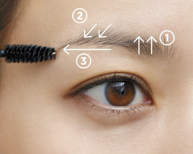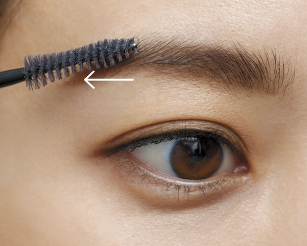 1 まずはスクリューブラシで毛流れを整えます。眉頭〜中央までは上方向に、眉山〜眉尻にかけては下方向に。最後、眉の下部分を水平にとかすと自然な仕上がりに。