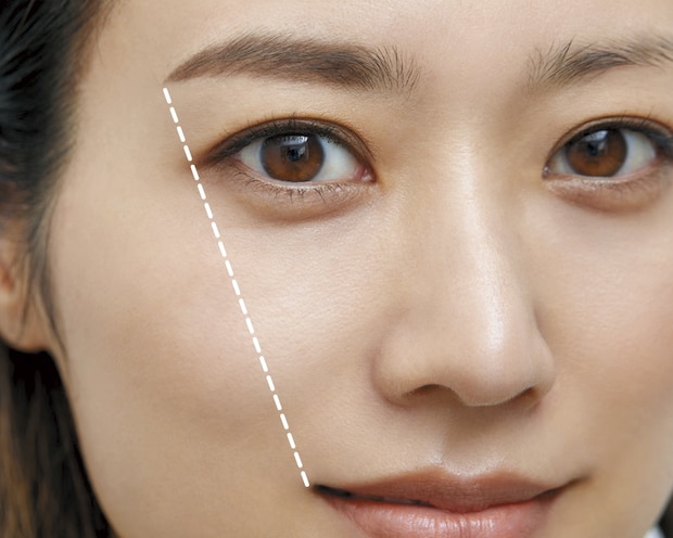 4 眉尻の長さの目安は、口角と目尻をつないだ延長線上。短過ぎず長過ぎないバランスで。眉山の位置の目安は、黒目の外側。ただし意識しすぎないのが、今っぽい。
