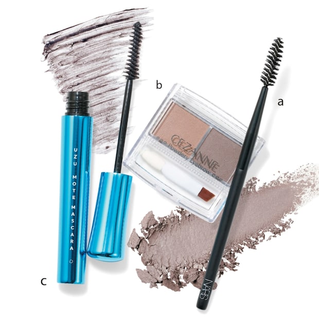 使うのはこの3アイテム。a.スクリューの間隔が広めで、毛流れをしっかり作りやすい。ブロースプーリー#28 ¥1,980(NARS JAPAN) b.プチプラの概念を覆す色みと発色、もち! パウダリーアイブロウ P2 ¥528(セザンヌ化粧品) c.透ける黒のベース液に黒の繊維入り。眉にもまつ毛にも使えるマルチっぷり。ウズ モテマスカラTM CLEAR ¥1,980(UZU BY FLOWFUSHI)