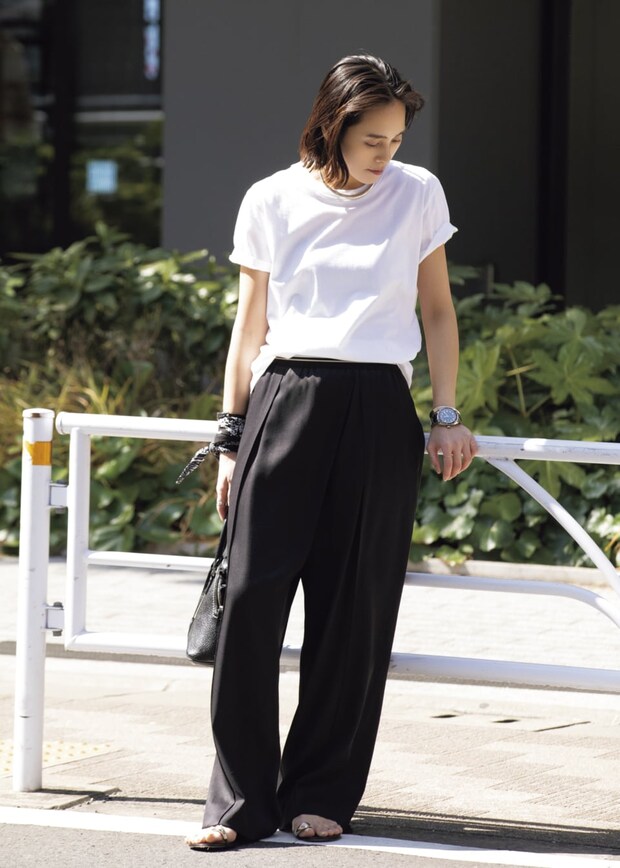 白T×ブラックパンツのミニマルコーデが洒落てる大室さん。Tシャツの袖の折り返しや裾の着崩し方、手首まわりの小物使いなど、細部まで計算し尽くされた着こなしはさすがの一言。