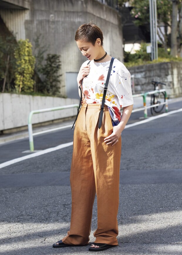 カラフルなペインティングが存在感たっぷりのTシャツに、キレイめシルエットのパンツを合わせた、メンズライクなTシャツスタイル。サスペンダーやサンダルのレザーでトラッドな雰囲気に。