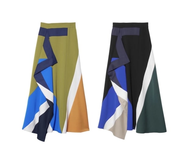 異素材を組み合わせたマルチカラーの切り替えデザインがインパクトのあるスカート。適度なボリュームはありつつ、サラリとした素材なので広がり過ぎず普段使いもしやすい。スカートの色が印象的な分、小物はホワイトでヌケ感を作ったり、ブラックで引き締めると合わせやすい。