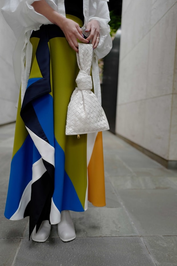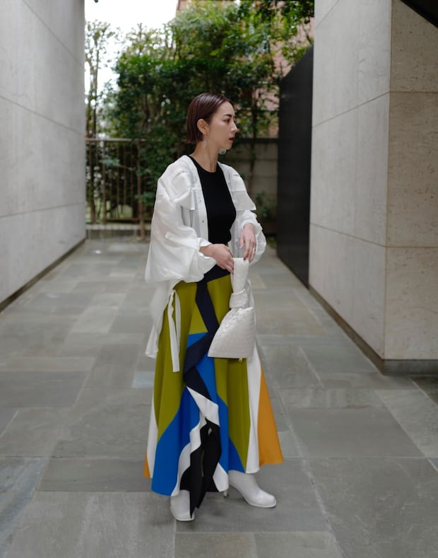 「春らしく気持ちも明るくなるような、パッと目を引くスカートを主役にコーディネート。スカート以外はモノトーンでまとめてスカートの色柄やシルエットを引き立たせています。オーバーサイズのシャツをラフに羽織り、小物はホワイトでヌケ感を出すなどして、カジュアルダウンしました」