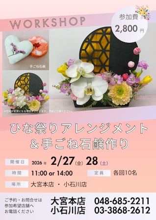 「らんや大宮本店」および「らんや小石川店」にて開催する「ひな祭りアレンジメント&手ごね石鹸作り」は、ひな祭りをテーマにした季節感あふれるフラワーアレンジメント制作と、香りや色を楽しめる手ごね石鹸作りを同時に体験できる内容だ。子どもから大人まで、ものづくりの楽しさを感じられる春の特別企画となっている。