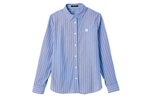 小さめの襟など、削ぎ落されたコンパクトなフォルムのシャツ。着こなしの幅は無限です! ストライプシャツ¥28,600(アクアスキュータム)