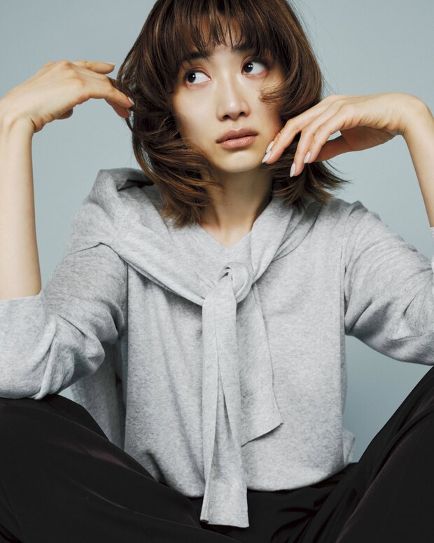 アンサンブルで楽しむ、ニットのコーデ。カーディガンをサラッと肩で巻いて、大人の余裕と遊び心を。Vネックニット¥36,300、ニットカーディガン¥42,900、パンツ¥36,300(全てアクアスキュータム)