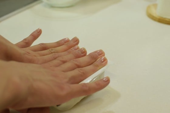 しっかりと水を切るためによく押し込みます。崩れないように豆腐の容器を利用します。