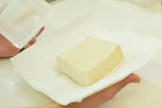 豆腐が崩れないよう、取り出すときは慎重に。やさしく取り出してキッチンペーパーにのせます。