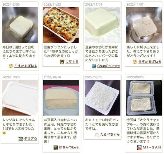 つくれぽ(作りましたフォトレポートのこと)にも「3回絞って白和えに。すぐにできて本当に助かります」「豆腐の水切りが簡単にできました。ハンバーグの具になりました!」など、時短でできる水切り方法を絶賛する声がたくさん届いています。