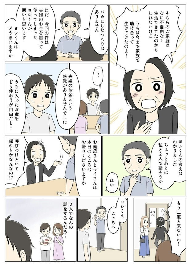 数日後、ヨシ・義母・マイと離婚に向けた話し合いの場が設けられました。義母はお金を取ったことに悪びれる様子もなく、マイに至ってはお金もらえるなら離婚した方がいいと論外の発言…。ヨシは離婚はしたくないと言うものの、義実家と縁でも切らない限りはずっと義母やマイに無心され、利用され続けてしまうのかもしれません。