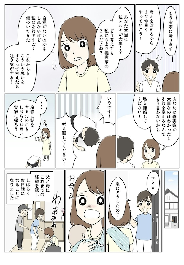 離婚してほしいと話すアイコにヨシは土下座をして離婚はしたくないと話します。しかし、アイコにはもうヨシの声は届いていませんでした。実家に帰り、両親に事情を説明すると父は両家での話し合いを提案してくれました。