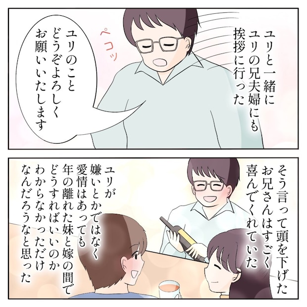 その後、ユリと一緒に、ユリの兄夫婦にも挨拶に。「ユリのこと、どうぞよろしくお願いいたします」そう言ってきちんと頭を下げるユリのお兄さんはすごく喜んでくれていて、ユリが嫌いとかではなく、愛情はあっても、年の離れた妹と嫁の間で、どうすればいいのかわからなかっただけなんだろうな、と思ったのでした。