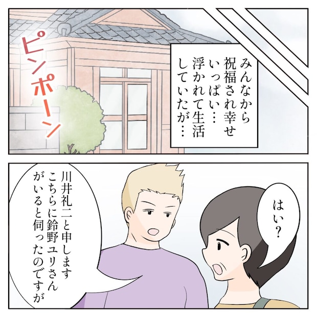そんな、みんなから祝福され幸せいっぱいの浮かれた生活を送っていると・・、ある日突然玄関のインターホンが鳴りました。「はい?」母さんが出ると、「川井礼二と申します。こちらに鈴野ユリさんがいると伺ったのですが」一人の男性が玄関に立っていました。