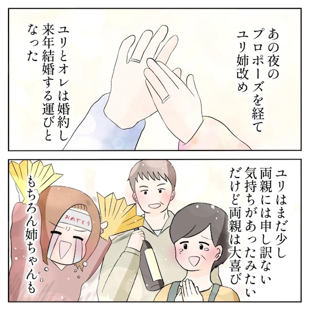 あの夜のプロポーズを経て、ユリ姉改めユリと俺は婚約し、翌年結婚することに。ユリは、まだ少し両親には申し訳ない気持ちがあったみたいだけど、両親は大喜び、もちろん姉ちゃんも喜んでくれました。