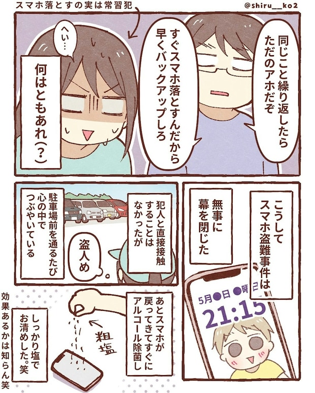 スマホを紛失し、盗難に遭うという経験をした、しる子さん。自身の経験から、注意喚起と対策についてまとめています。とても参考になりますね。