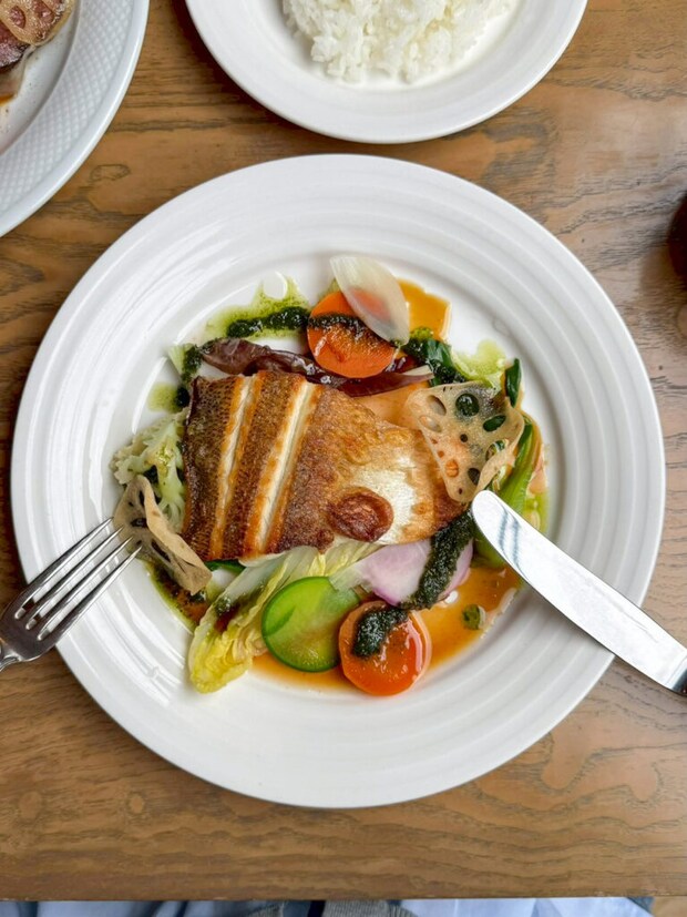 スズキのポワレは、皮目が香ばしく、身はふっくら。