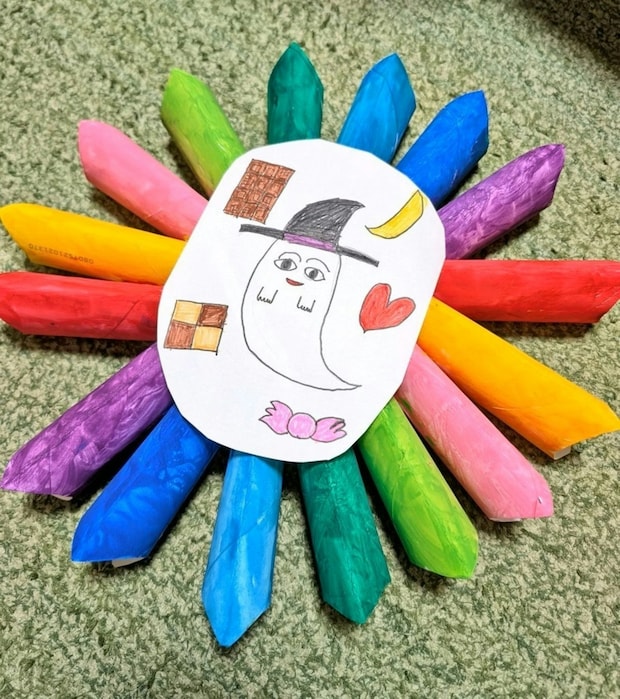 第2工程は芯16本の切り込みのない方をホチキスでカチンとめてクルンと輪にして。第3工程でカラフルに塗って中央に好きな絵を描いて貼れば、こんな飾りの出来上がり〜✨🥰 いくつも作ればもっと華やかになるよ😆🎶