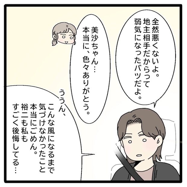 しかし美沙ちゃんは、「全然悪くないよ、地主相手だからって弱気になったバツだよ」とキッパリ言い切りました。とことん味方でいてくれる美沙ちゃんに、私は「本当に、色々ありがとう」とお礼を伝えました。美沙ちゃんは、正志の異変に早く気づけなかったことを悔やんでいる様子でしたが、私にとっては佐伯夫婦が相談に乗ってくれただけで十分すぎるほど心強かったです。