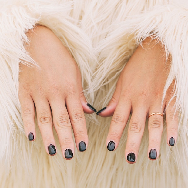 艶感のあるブラックネイルでクールな手元にまとめ。ファーコートを程よく引き締めてくれる。