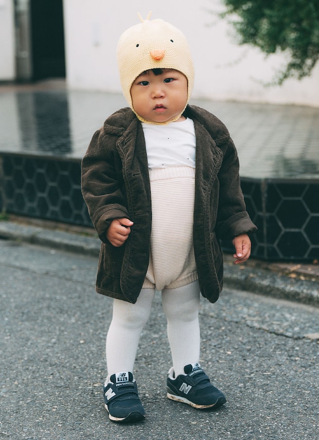 『ギャップ』のヒヨコ帽がなんともキュート! きちんとしたジャケットコーデに、遊び心を加えてキッズらしくアップデート。