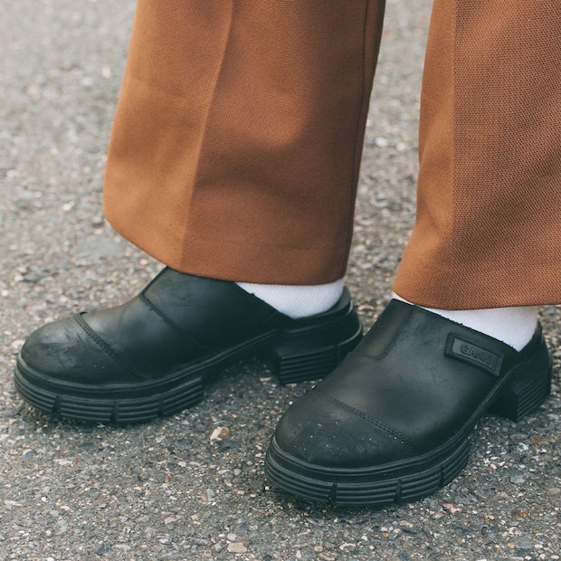 足元はモードな『ガニー』のサボシューズを抜擢! ブラックでスタイルを落ち着かせたのがグッド。