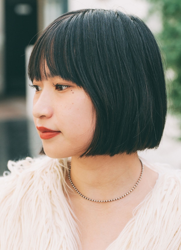 パツっとしたボブヘアに、テラコッタリップでレディな顔周りに昇華。『ポーリーン ストゥディオ』のネックレスで、ミニマムなアクセントをプラス!