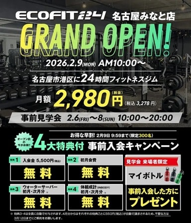 「エコフィット24 名古屋みなと店」では、グランドオープンを記念し、先着300名限定の入会キャンペーンを実施。