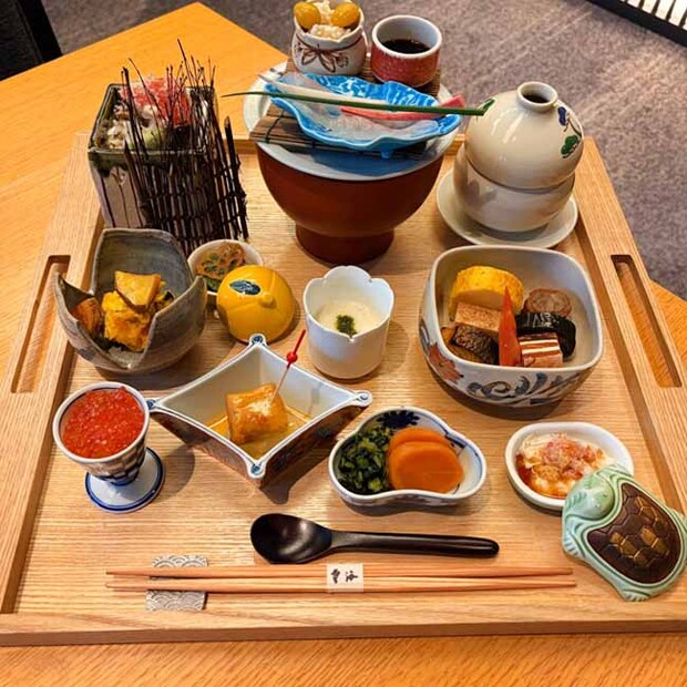 色とりどりの器とともに登場した「彩り膳」は、思わず声が漏れてしまうほど華やか。亀や柚子をかたどった愛らしい器も並びます。白木の角盆に整然と並べられた料理は、ボリューム感も十分。