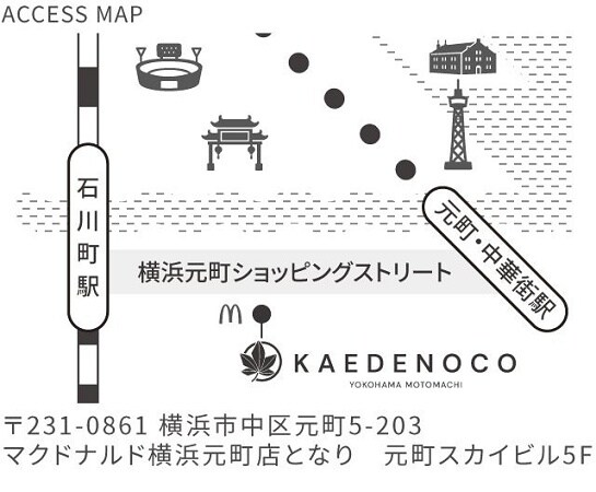 KAEDENOCOはJR石川町駅、みなとみらい線元町・中華街駅より徒歩圏内にあり、都内からのアクセスも良好。撮影後は、元町ショッピングストリートや中華街、周辺エリアでの散策も楽しむことができる。